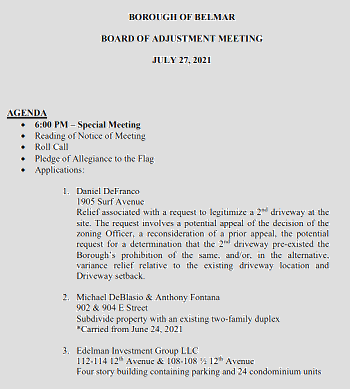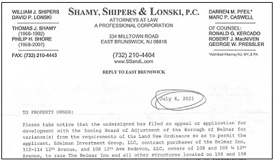 6. The cost incurred in purchasing the land and building of the Belmar Inn, along with the 3 units at 108/108 1⁄2 12th Ave., in addition to the thriving cash flow the Belmar Inn produces, does not make it economically viable to build single family houses and/or townhouses on the site. Since 2008, there has been a conditional amendment to the zoning which permitted the building of townhomes on this property, however no builder has found it financially feasible to pursue this type of project. That is why there has never before been an offer to buy the Belmar Inn. All other hotels in Belmar which have been purchased and demolished, or burned down, were replaced with condos or apartments. Condos are permissible in Belmar if the zoning board approves them. That is the purpose of the meeting on July 27. If this project gets approved, it sets no precedent to build condos all over town. Each project requesting variances stands alone based on its own merits and benefits for review by the board. The Belmar Zoning Board of Adjustment controls growth, and would not establish a broad policy that applies to all condominium applications.