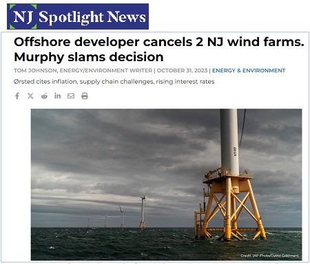 New Jersey’s taxpayers may be on the hook for hundreds of millions of dollars following a major offshore wind developer’s decision to cancel two projects off the blue state’s coast, Politico reported Thursday.