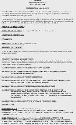 Tuesday Night’s Agenda for September 24, 2024 Council Meeting Posted on September 23, 2024 by Editor Click here for the Run For the Fallen Post Resolutions Ordinance 2024-19 Second Reading Ordinance 2024-20 Second Reading Ordinance 2024-21 First Reading
