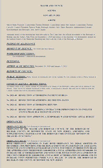 Tonight’s Agenda for upcoming meeting on January 19, 2021 Posted on January 19, 2021March 12, 2021 by Editor Bond Ordinance 2021-02 Resolution 2021-41 Resolution 2021-43 Resolution 2021-42additional” Resolution 2021-42 Resolution 2021-44