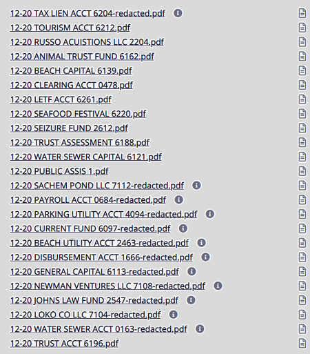December 2020 bank account statements from an OPRA request. Posted on February 4, 2021 by Editor Click on the image and it will take you to the Belmar OPRA page, you can then click on the small icon to the right of the line to view files without downloading.