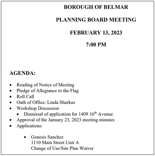 Belmar Planning Board Meeting of Monday, February 13, 2023 Posted on February 13, 2023February 14, 2023 by Editor New Board member Linda Sharkus sworn in Tha application was postponed until next meeting