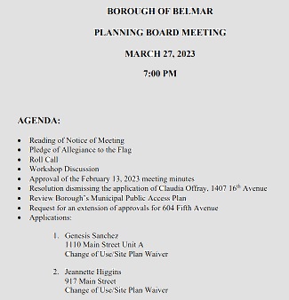 Belmar Planning Board Meeting – Monday, March 27, 2023 Posted on March 26, 2023March 28, 2023 by Editor