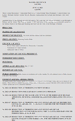 Tuesday Night’s Agenda for June 13, 2023 Council Meeting Posted on June 12, 2023June 13, 2023 by Editor Resolutions 6.13.2023-Schedule for Salary Resolution Payment of bills List Lead Grant Assistance Program Ordinance 2023-10 Circle of Friends – Taylor Pavilion