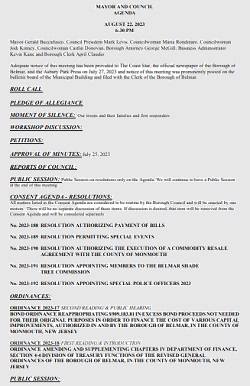 Tuesday Night’s Agenda for August 22, 2023 Council Meeting Posted on August 21, 2023September 12, 2023 by Editor Resolutions Ordinance 2023-17 Second reading & Public hearing Ordinance 2023-18 First reading & Introduction
