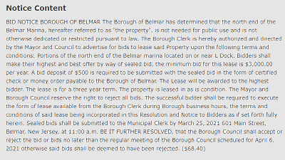 Leasing north end of the Belmar Marina? Posted on March 16, 2021March 18, 2021 by Editor “located on or near L Dock”