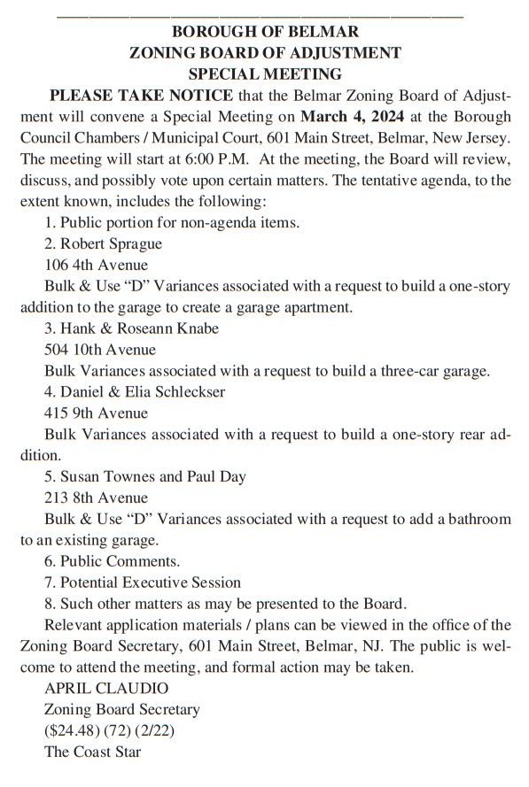Agenda for Special Zoning Board – Monday. March 4, 2024