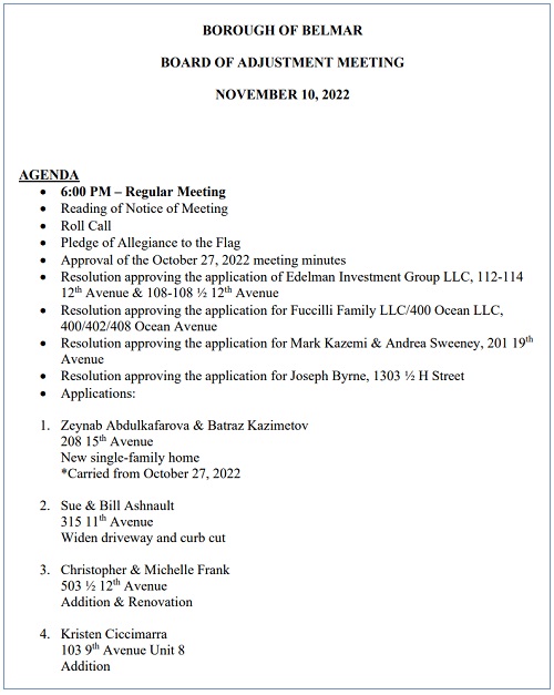 bookmark_borderBelmar Zoning Board Meeting of November 10, 2022 Posted on November 12, 2022November 12, 2022 by Editor Application for 15th Ave will be continued. Applications 3 and 4 were postponed.