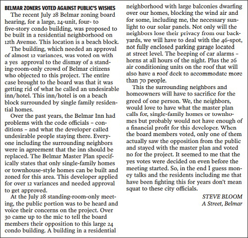 The Board voted IN FAVOR of the Belmar Inn Project.
