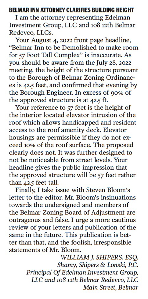 Mr. Shipers clarifies the Building Height for the Belmar Inn Project and