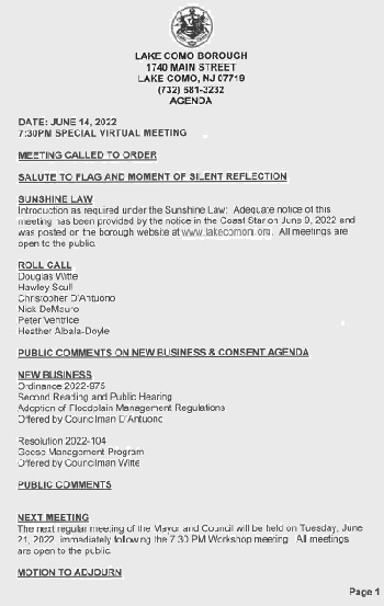 bookmark_borderLake Como Council Meeting of June 14, 2022