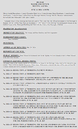 bookmark_borderTuesday Night’s Agenda for June 11, 2024 Council Meeting Posted on June 10, 2024June 10, 2024 by Editor Resolutions Ordinance 2024-11 Second Reading Ordinance 2024-12 Second Reading Ordinance 2024-13 Second Reading Ordinance 2024-14 First Reading There is an executive session