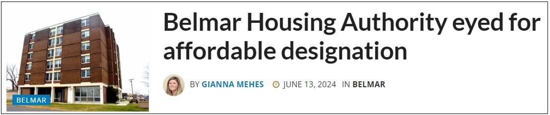 bookmark_borderBelmar Housing Authority might come under Affordable Housing? Posted on June 13, 2024June 13, 2024 by Editor Here is the abbreviated online article in today’s Coast Star Here is the link to the meeting where the mayor spoke about it Housing Authority Meeting – June 3, 2024 Here is the letter Click here to open the file for that letter
